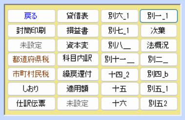[法人税確定申告書一括PDF保存/印刷]ボタンは全書類を一括して連続保存/印刷しますが、[法人税確定申告書個別PDF保存/印刷]ボタンを押すと2個の保存/印刷ボタンが消えて、下図のような個別の保存/印刷ボタンが表示されます。この個別ボタンを押すと各別表等を個別に保存/印刷することができます。