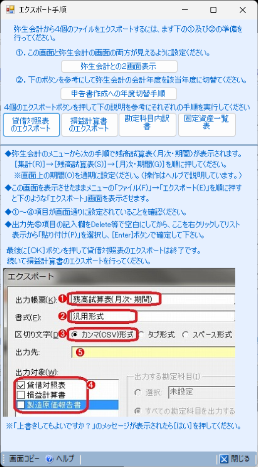 弥生会計からのエクスポート操作イメージ